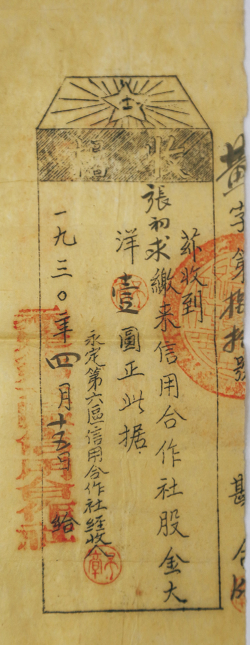张洪伟从一个密封的洋铁箱里小心翼翼地拿出一张发黄的土纸,最上面正中为一个五角星,星内框为一把镰刀和铁锤相互交叉,中间为黑底镂空留白的“收”和“据”两字,下方从左到右竖行书写“兹收到张初求缴来信用合作社股金大洋壹圆正此据”,落款为“永定第六区信用合作社经收人‘章予’的圆形私章 一九三〇年四月十五日给”,并盖有“永定第六区信用合作社”的竖条公章。