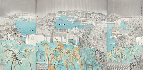 壁光作品中的山水作为家园与精神的栖居地,其形式感突破了传统笔墨和题材的限度,是带有理想化的自然山水,亦是大自然山水的典型代表,对于每一位生于北方的人来说,都将心驰神往,虽非家乡,却是画家心中的“远方”。欣赏壁光作品,我们看到的不仅仅是诗情画意,更是一种高级的理性表达,不同明暗的景物层次,白墙、太湖石、石幛、漏窗、黛瓦等有序交织,带有装饰构成的长廊、植被、曲水,经过高度提炼,简化成符号性艺术语言,凸显画面的时代性,同时在传统笔墨基础上,加大了线的运用,条理清晰又不失笔墨趣味,加上色调的独具匠心,使得画面淡雅清新之气扑面而来。