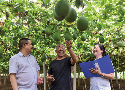 湖北枣阳农商银行支农更重智农,大力推进“一村一品”建设,支持乡村特色产业发展,吸引众多外出打工农民返乡创业,促进了农民增收,农业增效。在该行信贷支持下,七方镇邓庄村积极发展吊瓜产业,亩产值达7500元。村民王安忠的14亩吊瓜,为他年增加收入达10万元。图为该行信贷人员在瓜棚查看吊瓜长势。