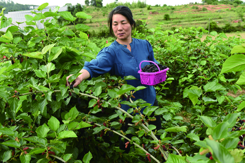 江西省南丰县桑田镇古城村黎家村小组村民肖小英,几年前在南丰农商银行30万元贷款扶持下,租赁当地荒山30亩,并从浙江嘉兴购进2000多株桑葚种苗,开办古城桑葚釆摘园。经几年科学耐心的管理,眼下釆摘园迎来丰收年,预计桑葚总产量达10万多斤,除卖鲜果外还可加工成桑葚酒5000斤,产值可达36万元。图为近日肖小英在园里采摘桑葚鲜果。